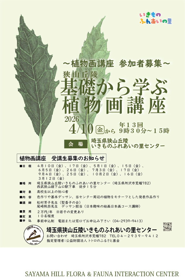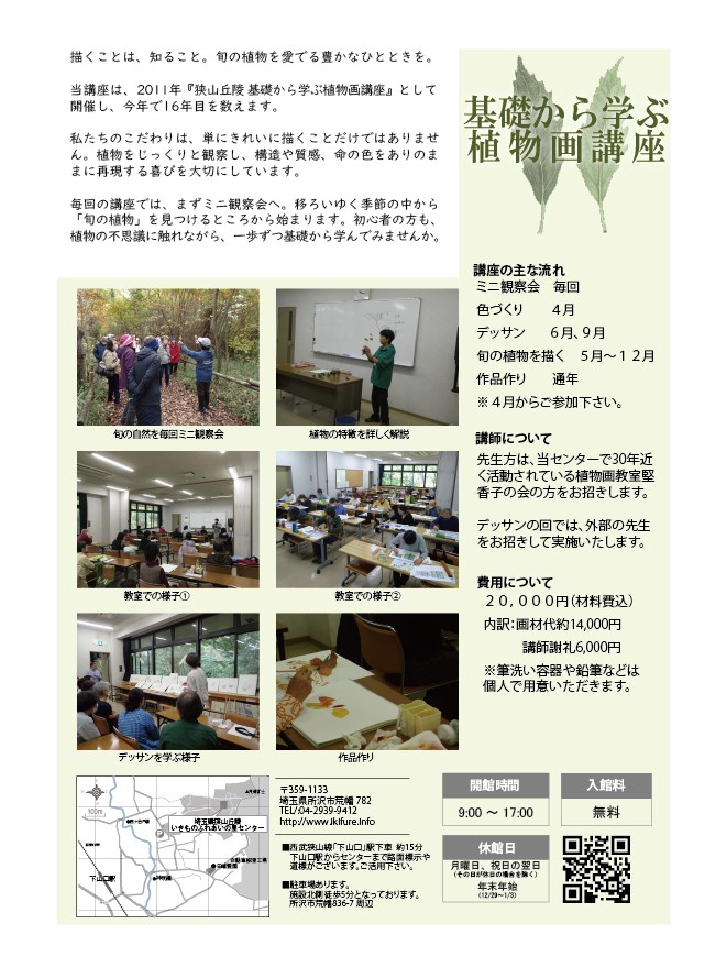 当講座は、2011年『狭山丘陵 基礎から学ぶ植物画講座』として開催し、今年で16年目を数えます。