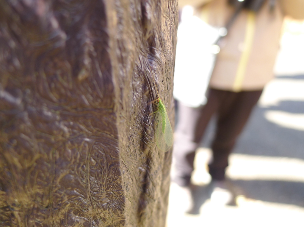 擬木柵にはクサカゲロウの仲間が越冬中。