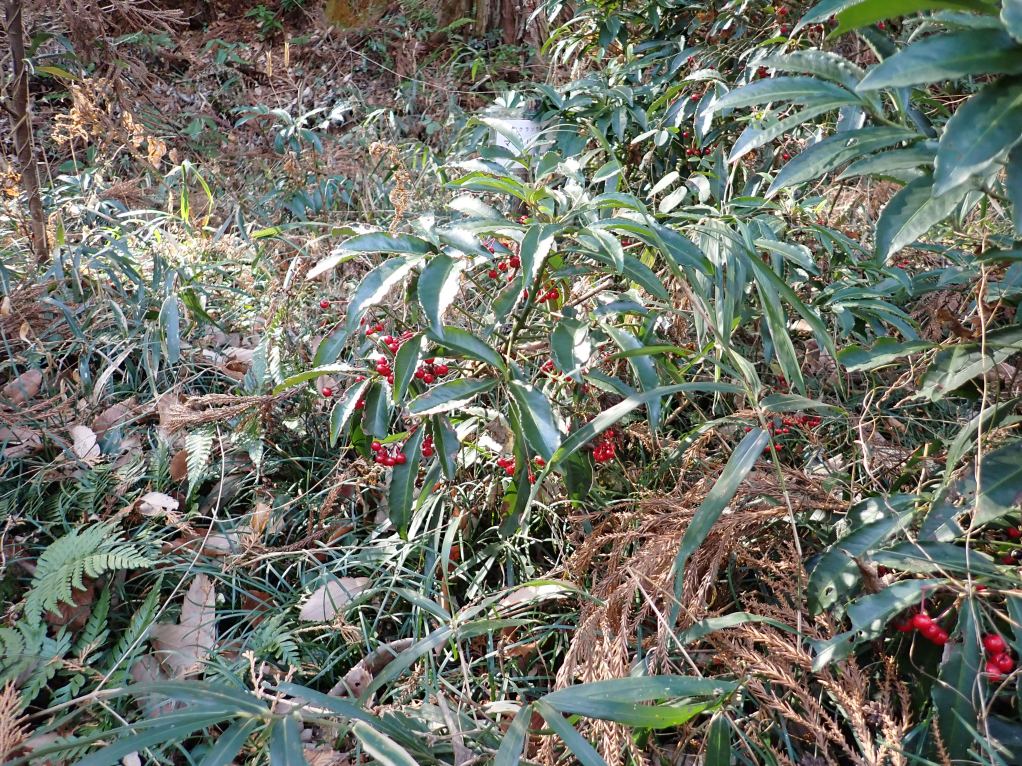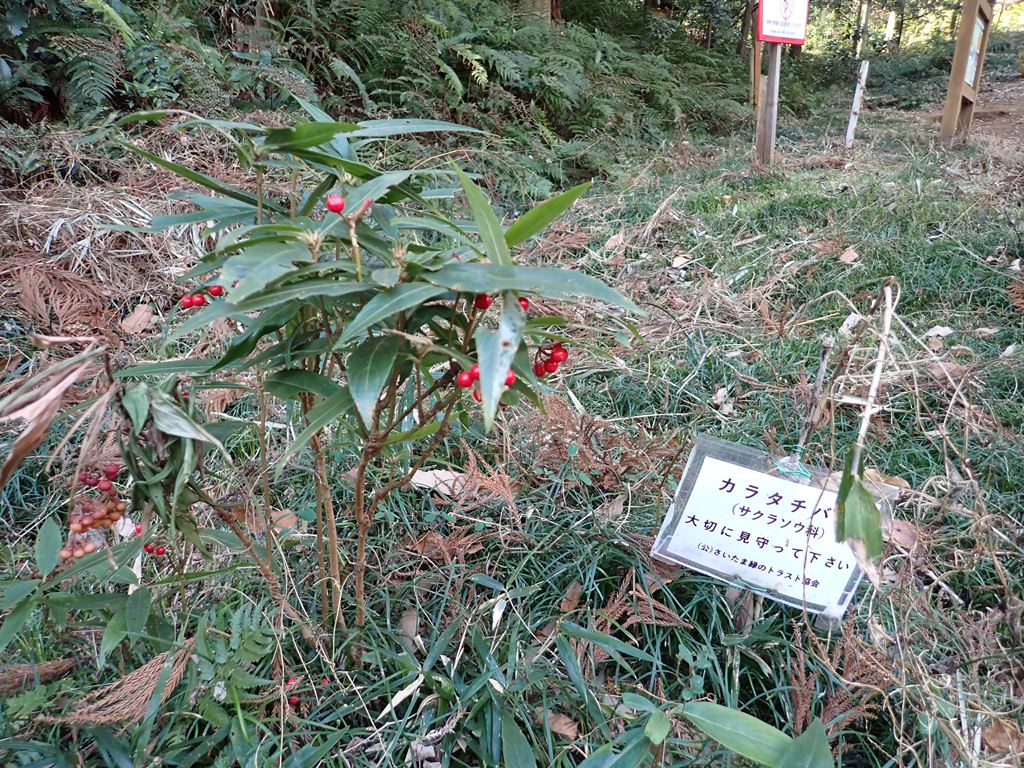 マンリョウとカラタチバナです。カラタチバナは別名を百両とも呼ばれ、マンリョウと共に縁起の良い植物とされています。葉っぱの形状で見分けることが出来ました。他にもヤマザクラ、イヌザクラ、リョウブ、ムラサキシキブ、クヌギ、コナラなどの冬芽も観察しました。