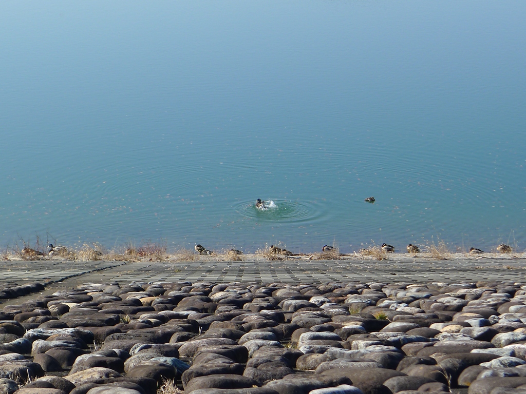 (4)湖の堤防側ではカモ類がお休み中。